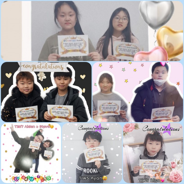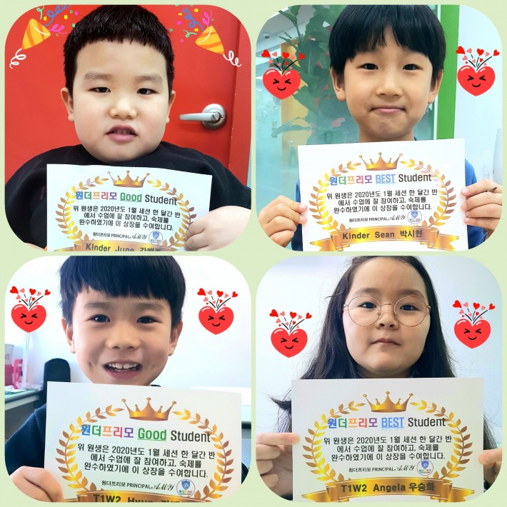 지난달(1월) 우리 원더프리모 학원에서 각 반별 우수학생들을 선발했습니다~^^ 적극적인 수업참여와 과제완료는 물론, 많은 애정을 가지고 열심히 노력해준 멋진 학생들에게 박수를 보냅니다~♡